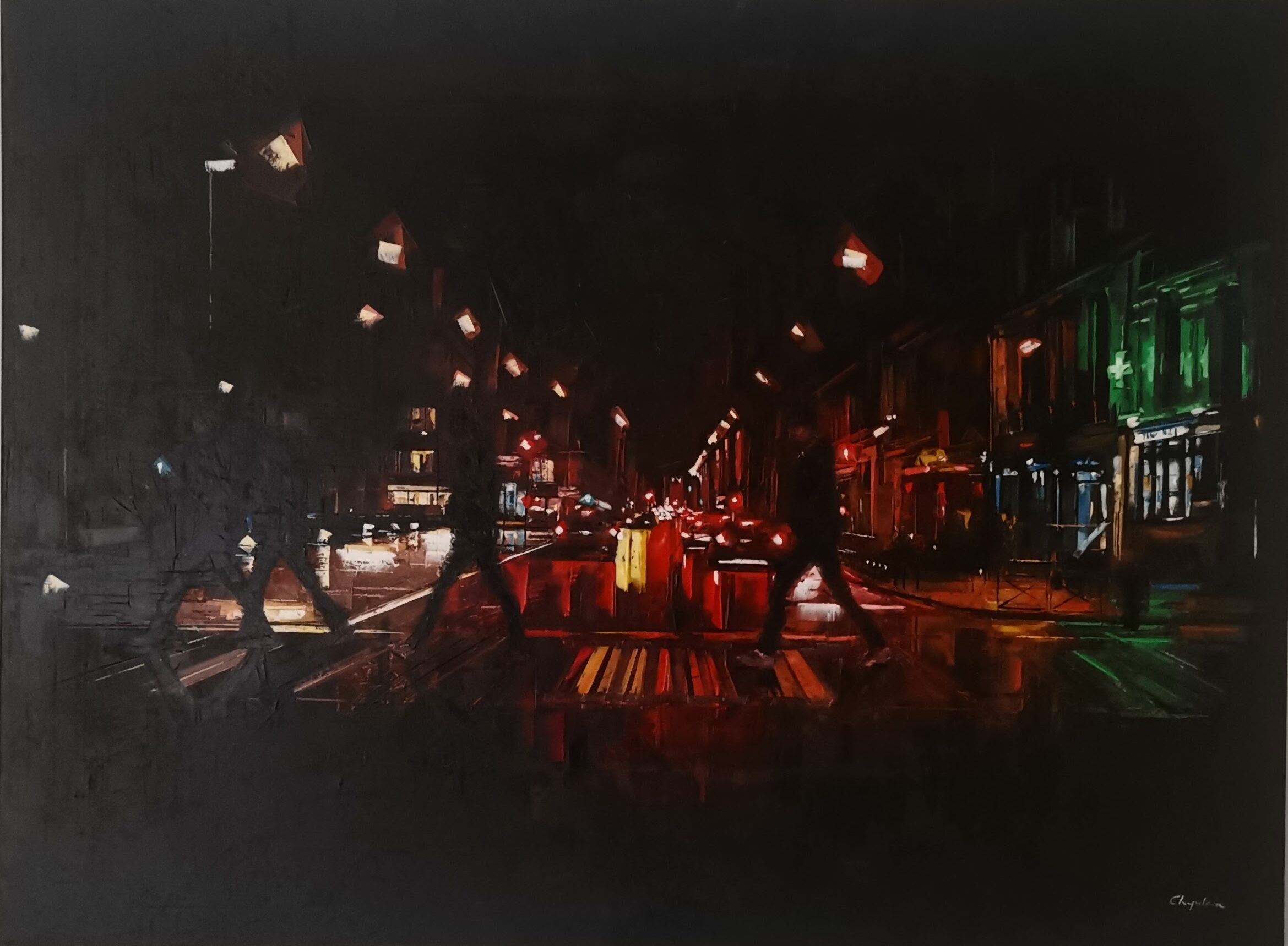 ses rues, ses nuits, ses reflets, tout ce qui compose son quotidien réel. Je peins au couteau cette énergie urbaine avec des couleurs vives et des traits tranchants. Plus loin, je poursuis la même démarche dans les villes portuaires : capturer la beauté brute du monde maritime, ses chantiers, ses machines, ses horizons et la majesté de ses bâtiments.