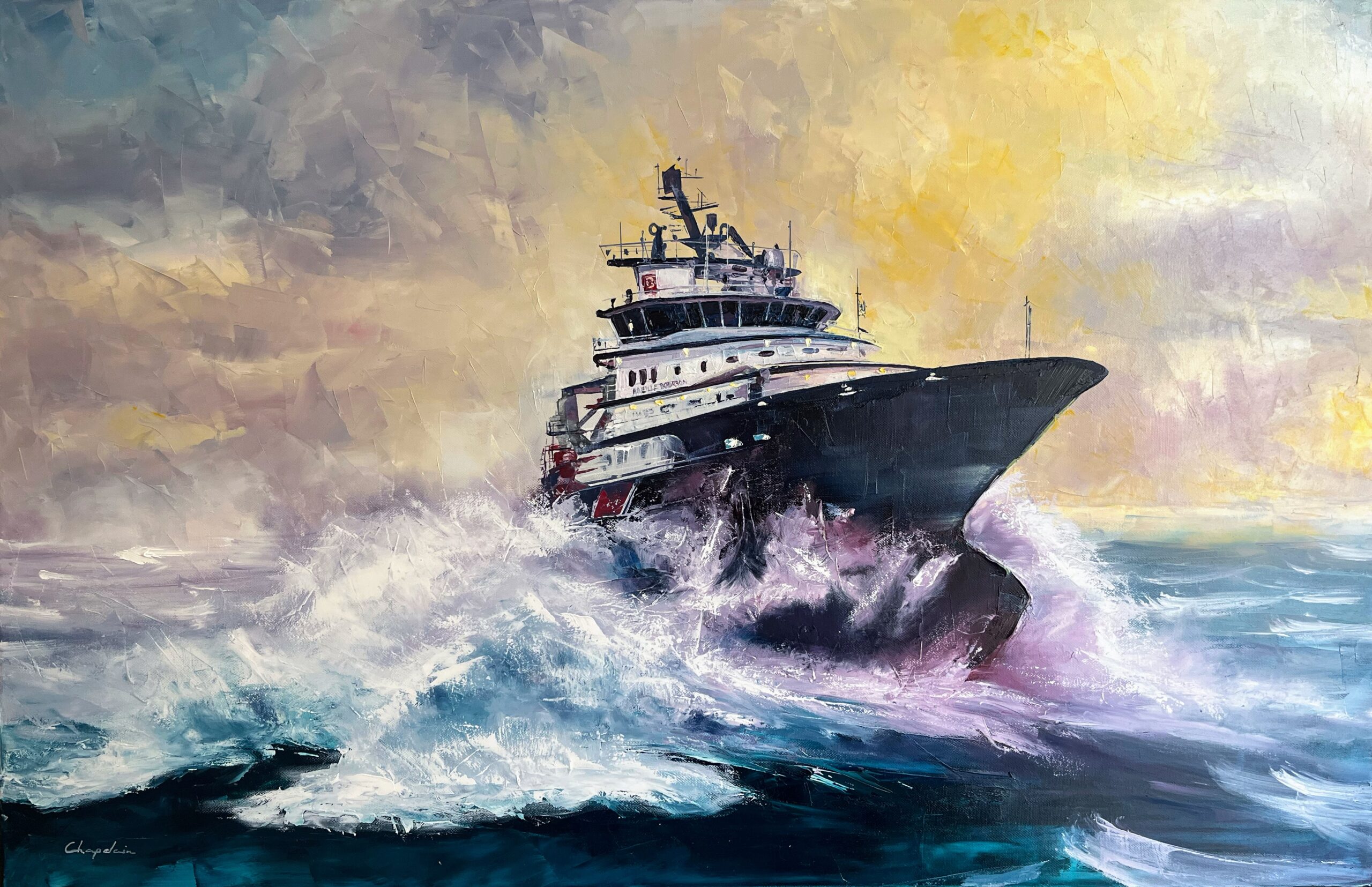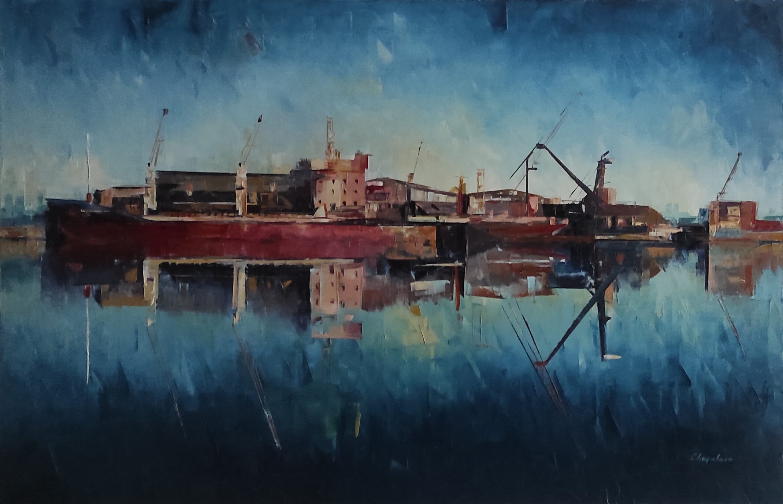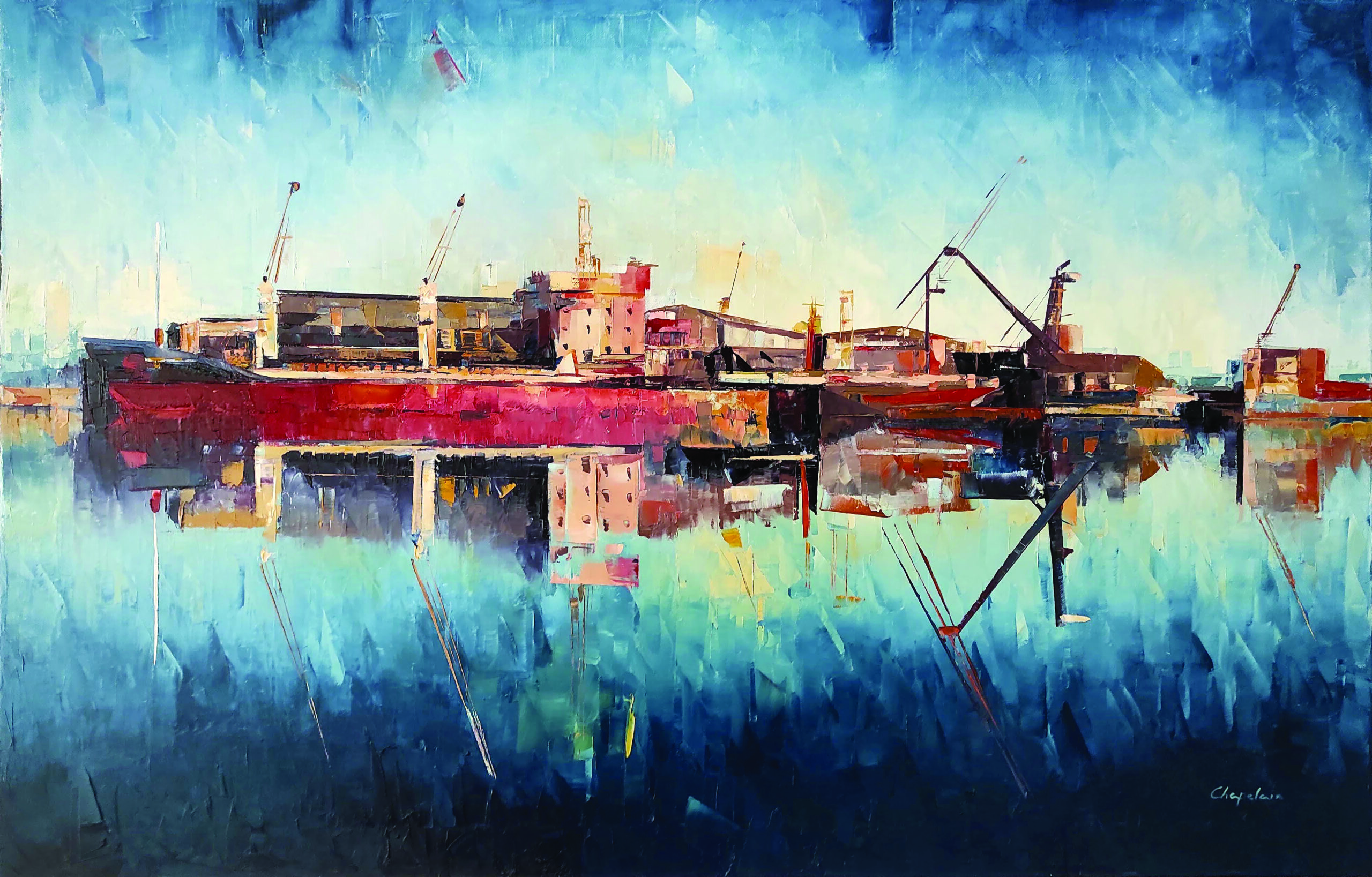 Je peins au couteau les paysages portuaires et l’univers maritime. Je pars à la rencontre des villes de bord de mer pour capturer la beauté du quotidien marin : la rudesse des chantiers, les couleurs délavées par le temps, les machines, les hommes, la rouille et les horizons.